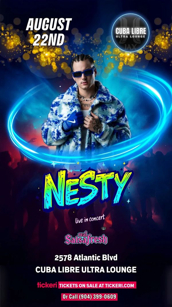 Preparence para una noche inolvidable por primera vez en Jacksonville, Nesty uno de los talentos mas frescos del genero en el escenario de Cuba Libre Ultra Lounge.